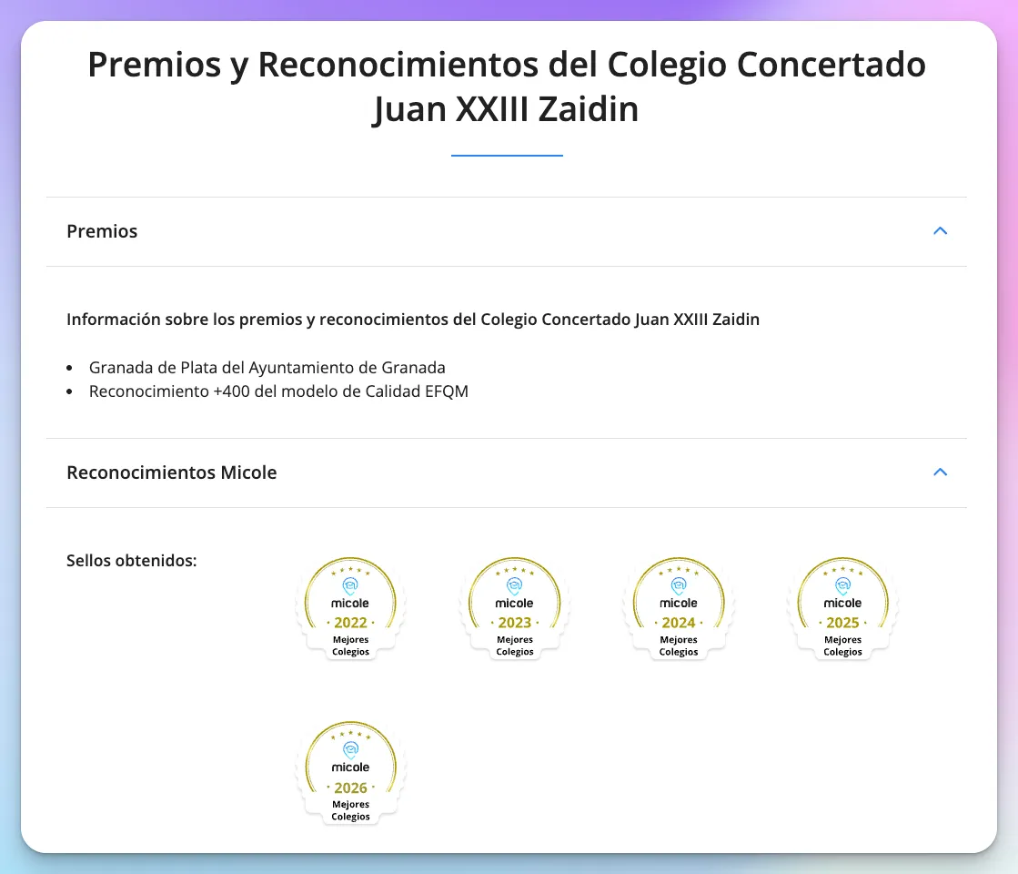 En el Juan XXIII Zaidín celebramos con enorme alegría un nuevo reconocimiento que refuerza la confianza en nuestro proyecto educativo. Según la plataforma micole.net, hemos sido destacados como uno de los mejores colegios de Granada para 2026, afianzando una trayectoria de excelencia durante cinco años consecutivos.